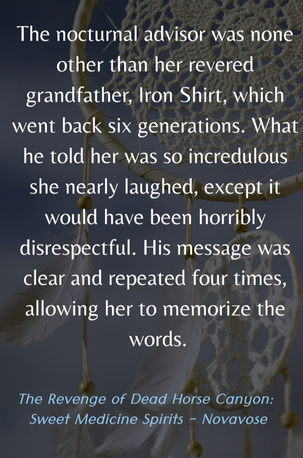 Here’s one teaser from “Revenge of Dead Horse Canyon: Sweet Medicine Spirits – Novavose” where I had absolutely no idea what would happen. The character in question popped up quite late in the book, but she fit perfectly.