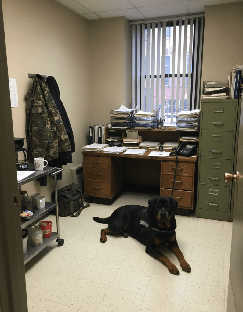 Bernie’s dog, Terminator, is a Rottweiler. He hangs out below his desk and is quick to reassure his master by placing his chin on his good leg when he appears upset, which a lot, having to deal with the likes of Eddie Johannsen.