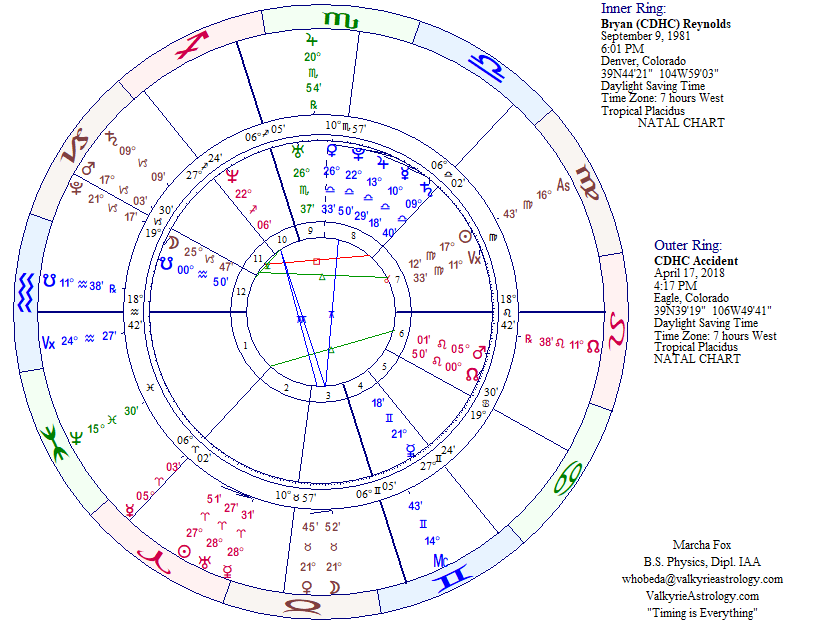 You astrologers out there will recognize this as a “biwheel.” It comprises Bryan’s chart with the transits for when the accident occurred, which is what Patrice is delineating in the first graphic.