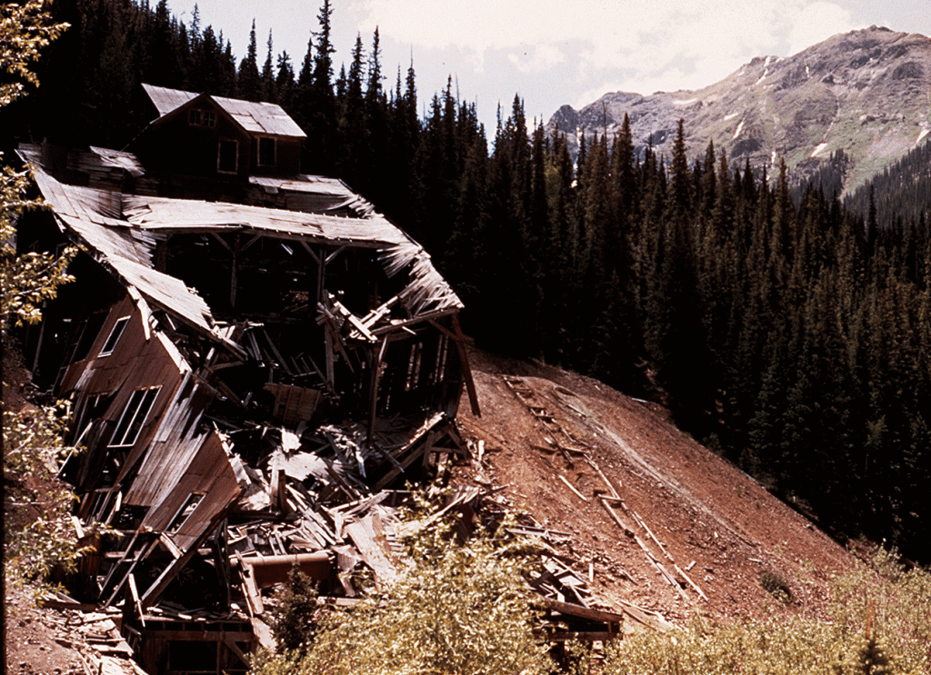 Collapsing mill at old mining town of Middleton. San Juan Mountains. San Juan County, Colorado. June 30, 1972. (Photo courtesy USGS)