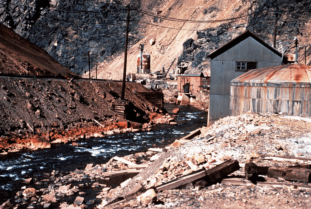 U.S. Geological Survey. Eagle River running through mining area at Gilman zinc mine on Battle Mountain, between Redcliff and Minturn. Eagle County, Colorado. ca. 1980. (Photo courtesy USGS)