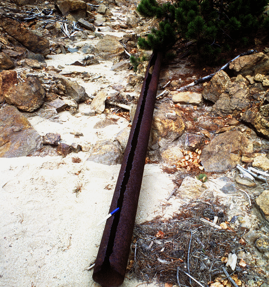 Corroded 6 inch steel pipe caused by acid mine drainage from gold/silver mine on Quartz Hill, southwest of Central City. Gilpin County, Colorado. October 1992. (Photo courtesy USGS)